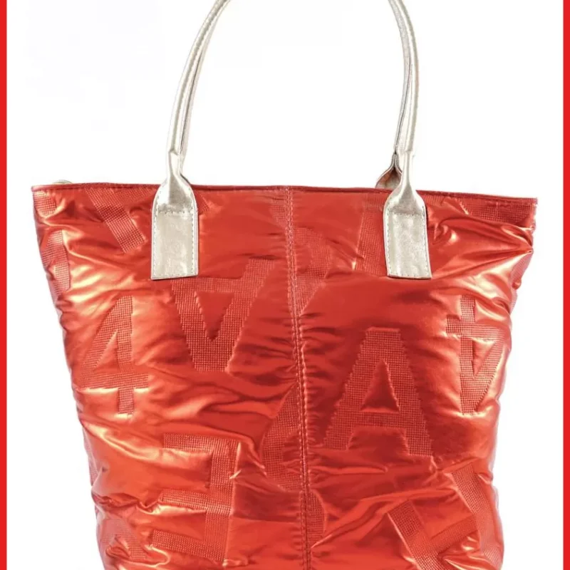 VIA55 nagyméretű válltáska, vízhatlan anyagból, bojttal díszített, piros színben. Elején középen varrott, pufi, puha anyagú. Anyagában betűk, számok díszítik. Vállpántja és a bojt csillogós arany színű. Nagyon könnyű darab, kényelmes viselet. Belseje egyterű, egy cipzáras és két benyúlós zsebe van. Méretei: 39×33×18 cm.